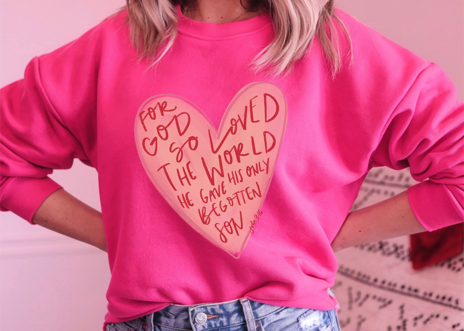 This cozy faith-based sweatshirt features a beautiful heart design inspired by John 3:16: